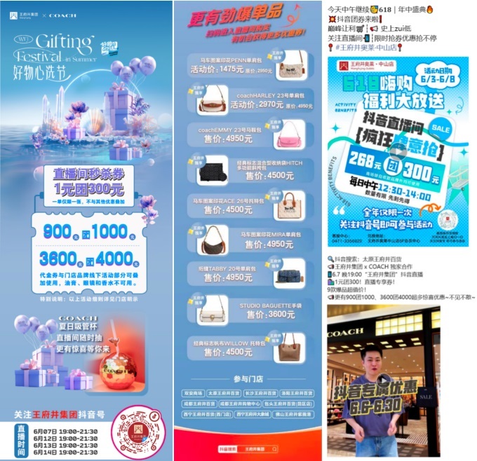 本次好货心选节期间,集团与Tiktok本地生活正式合作,充分利用平台活动资源,组织重点门店参与618Tiktok直播推广活动,与重点品牌COACH达成独家合作,联动王府井集团双安商场、长沙一家门店、成都一家门店、成都两家门店、佛山门店、包头一家门店、洛阳一家门店、西宁一家门店、西宁三家门店、太原门店进行专场直播。同时,赋能店铺直播能力,保证GMV直播产出。