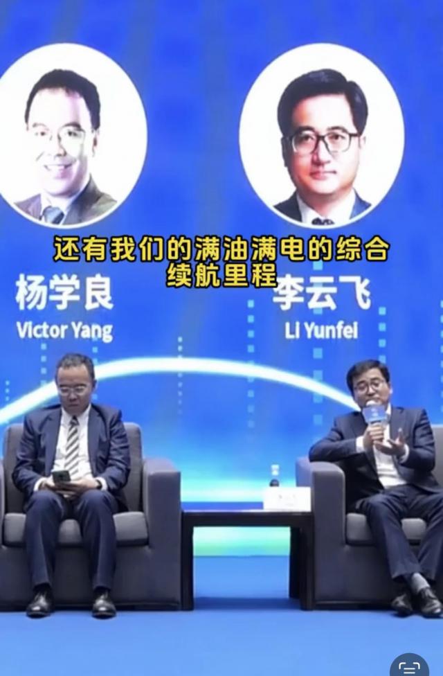 看,比亚迪总经理李云飞在发言中提到了比亚迪。 Dm-i 在技术方面,隔壁吉利副总裁杨学良开始直接看手机。