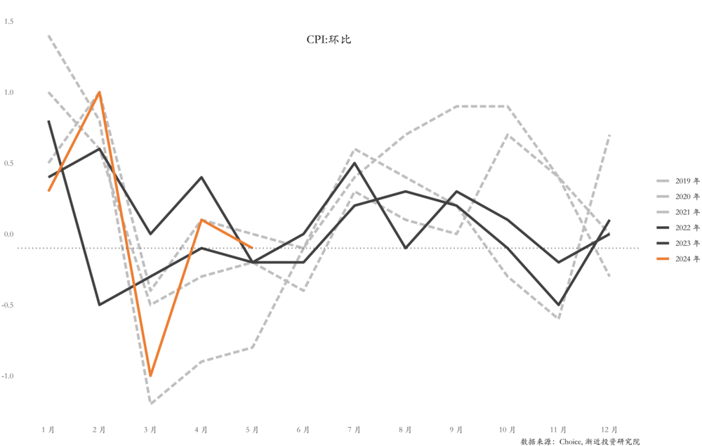 五月份CPI同比持平,环比下降。。与往年相比,今年5月份的CPI数据环比并不弱。但这主要是由于供应原因,食品价格出现了超季节性的复苏。但从服务项目和部分消费品价格波动来看,经济需求仍然不足,这也是目前市场仍处于低位的核心原因。