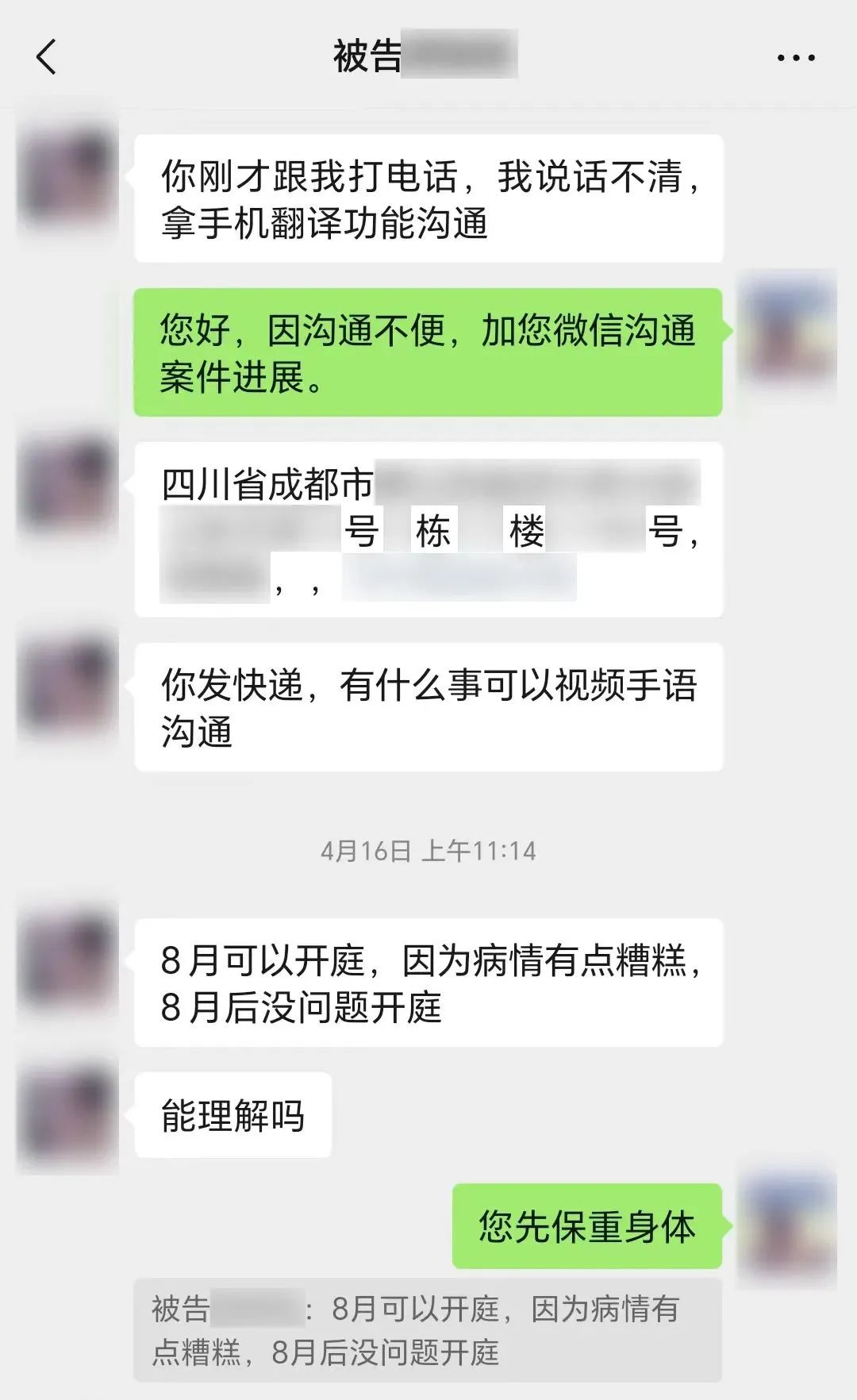 基于案件双方的特殊身体状况,为了更好的沟通,李运普三思而后行,决定给赵硕加两个人的微信,方便前期工作。申请提交后,很快就被允许了。“法官,我听不到你在电话里说什么。我用语音软件翻译,然后给你发一个文字微信。”这样,沟通效率提高了很多。