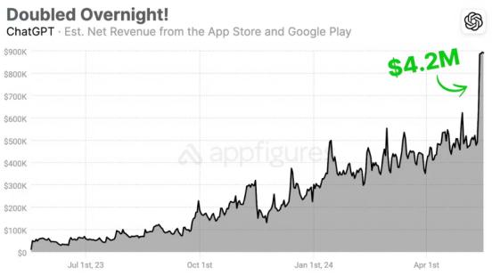 数据显示,ChatGPT 移动式应用程序的净收入 GPT-4o 这一天首次增加了22%。截至5月17日,ChatGPT 移动应用在 App Store 和 Google Play 在两个平台上共同赚钱 420 净收入一万美元。