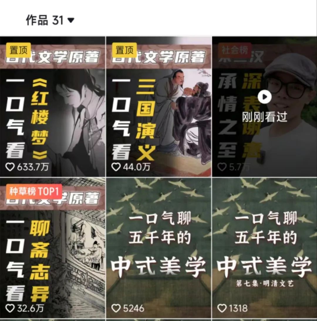 一条消耗他 5 制作一个月的时间 “ 一口气看《红楼梦》 ” 这段视频爆红,开启了他。 “ 一口气快速阅读文学原始 ” 系列。