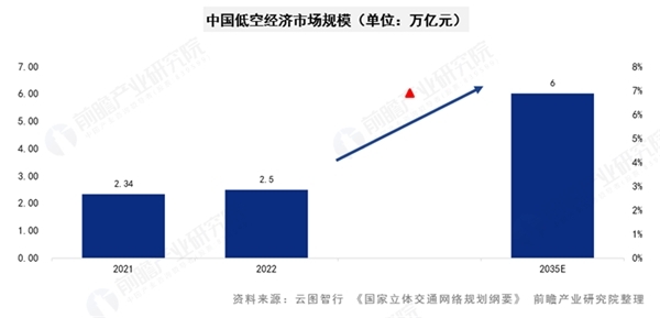 与此同时,另一个主要的产业出路——低空经济正在迅速形成。根据前瞻产业研究院《2024年中国低空经济报告》,2022年中国低空经济产业市场规模为2.5万亿元。到2035年,中央政府预计中国低空经济产业规模将超过6万亿元,增长空间巨大。