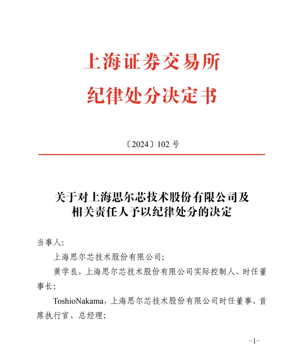 6月11日,上海证券交易所(以下简称“上海证券交易所”)官网发布决定,对上海思尔芯科技有限公司(以下简称“思尔芯”)及相关责任人给予纪律处分。