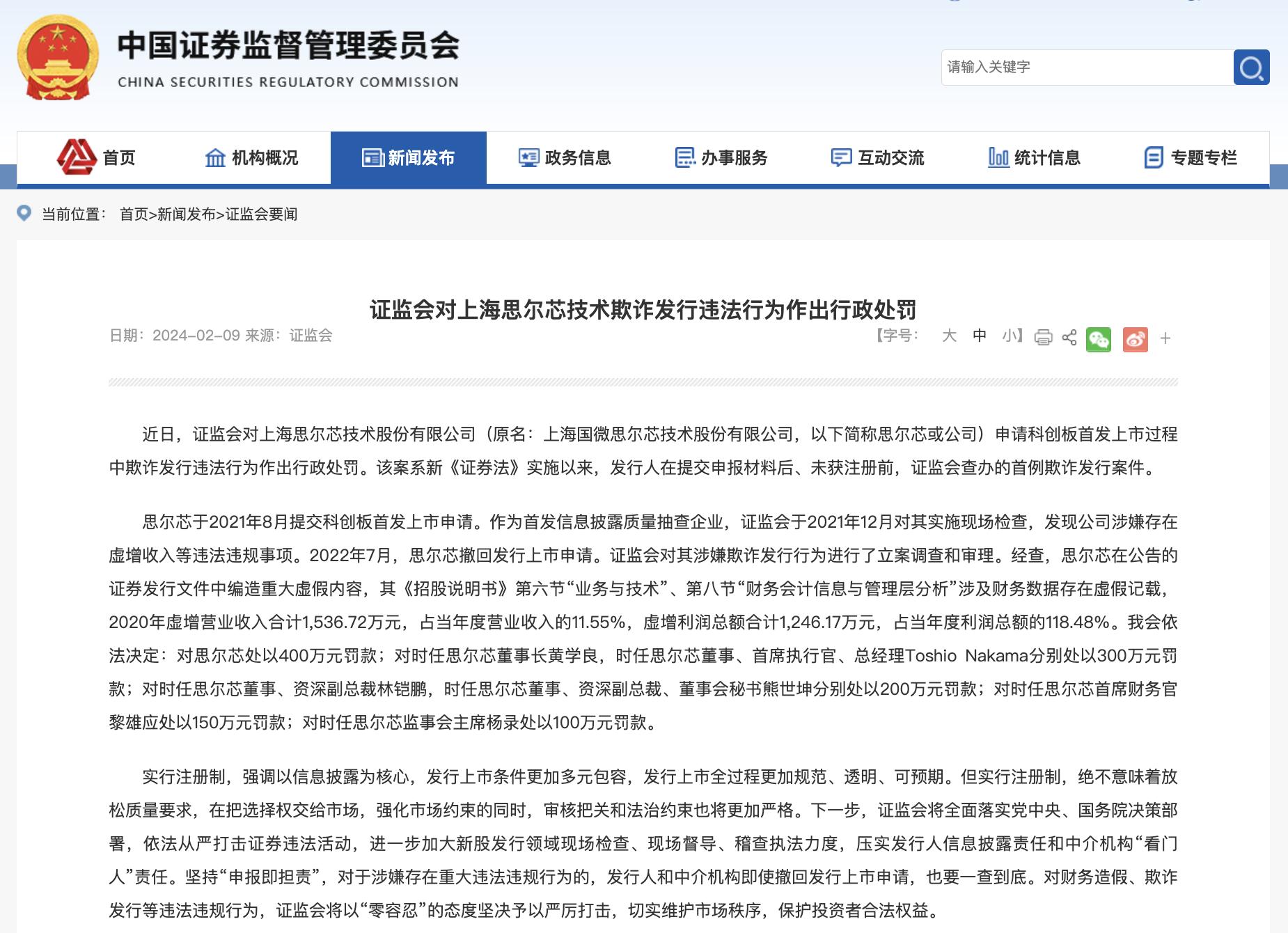 今年年初,证监会对思尔芯在申请科技创新板首次上市时的欺诈行为进行了行政处罚。具体而言,证监会对思尔芯处以400万元罚款;时任思尔芯董事长黄学良、时任思尔芯董事、CEO、Toshio总经理 对于时任思尔芯董事、资深副总裁林铠鹏,Nakama分别处以300万元罚款,时任思尔芯董事、高级副总裁、董事会秘书熊世坤各处罚款200万元;时任思尔芯首席财务官黎雄应罚款150万元;时任思尔芯监事会主席杨录被罚款100万元。上述罚款总额为1150万元。