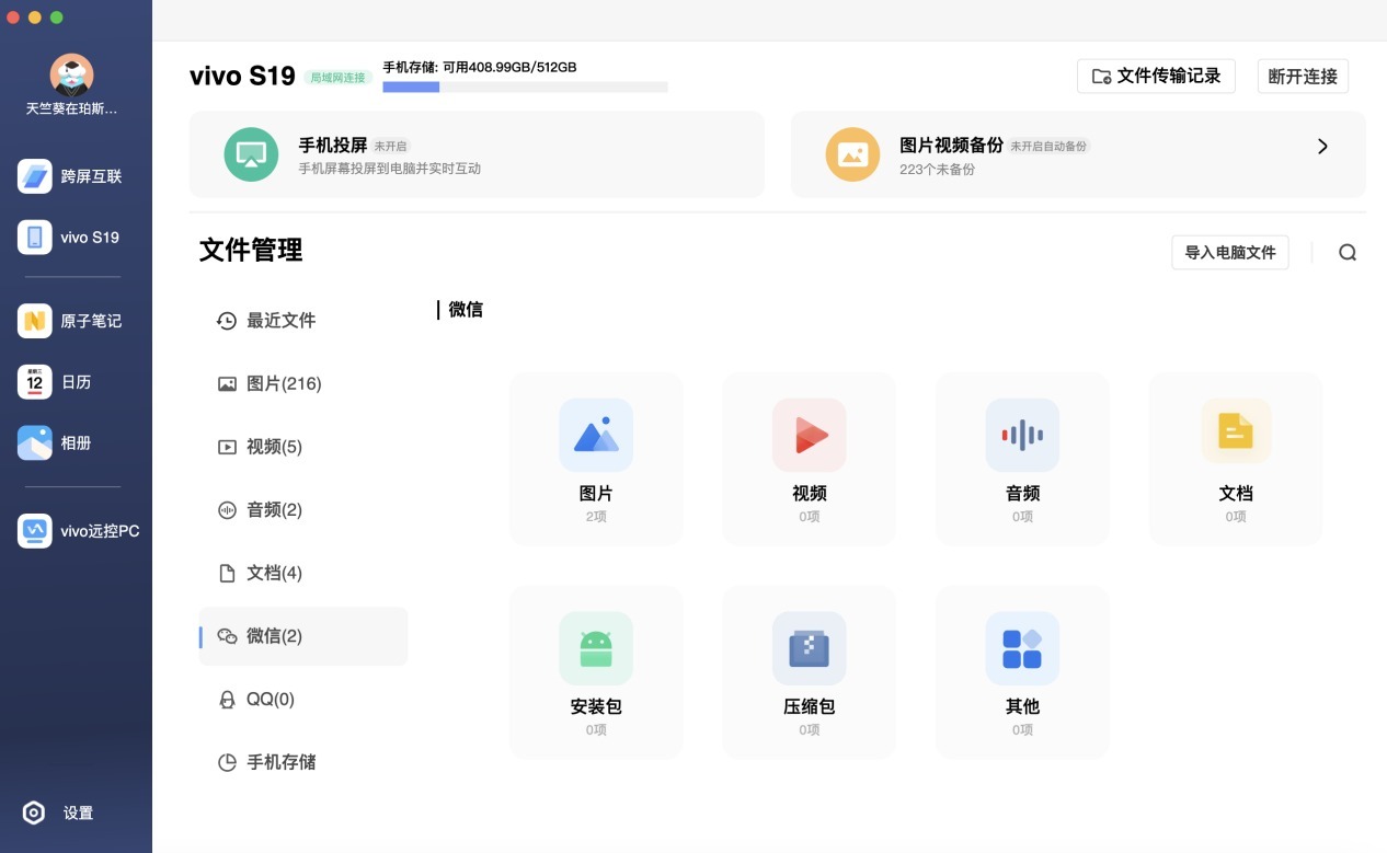 以vivo的办公套件为例。众所周知,vivo没有电脑产品线,但这并没有耽误vivo扩展自己的生态。vivo的办公三件套适合Windows和Mac,这个应用集成了手机屏幕投影、原子笔记、跨屏互联等多种功能。