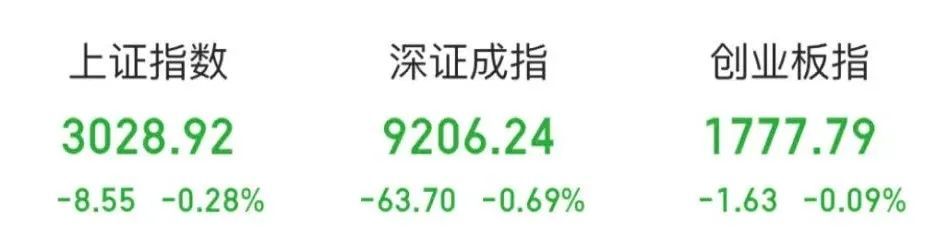 截至收盘,上证指数下跌0.28%,深证指数下跌0.69%,创业板指数下跌0.09%。今天沪深股市成交额为7525亿元,较上一个交易日成交量为605亿元。