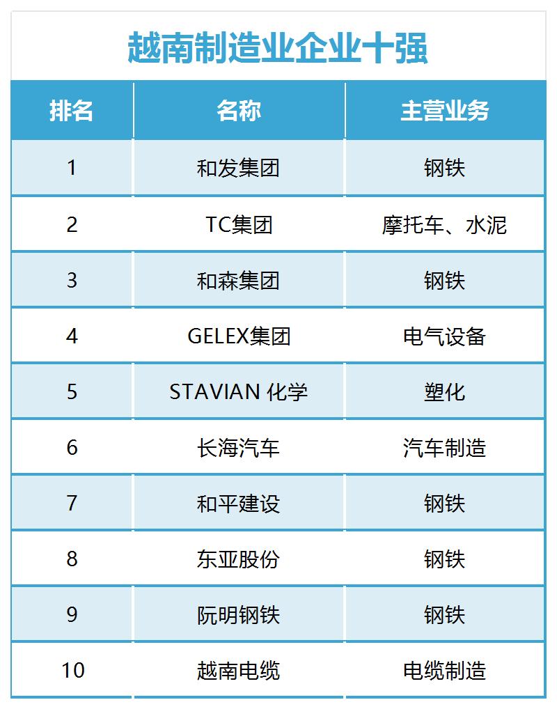 我查了一下越南十大制造业民营企业,包括钢铁和发集团、和森集团、和平建设、东亚股份、阮明钢铁、熔融行业、STAVIAN 从事汽车工业的长海集团和清丛集团,以及电气设备的GELEX集团。