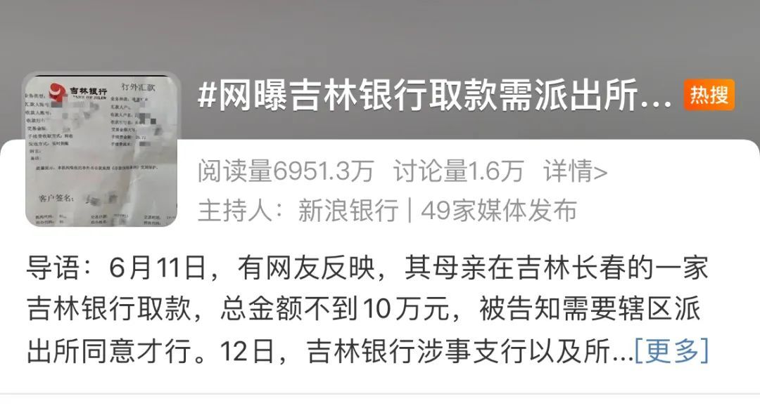 6月11日,有网友发布视频称,母亲携带储蓄卡、身份证等证件,前往吉林银行取款,总额不足10万元。银行告诉她,她需要派出所的同意才能处理。最后,他们等了很久,经派出所批准后,在银行窗口成功转账。
