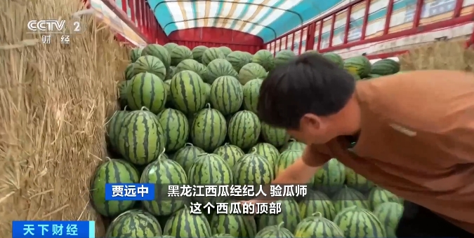 黑龙江西瓜经纪人 验瓜师 贾远中:西瓜的顶部和臀部是最硬的,它们相压有承受能力,中间部分一放下,西瓜就会压扁。