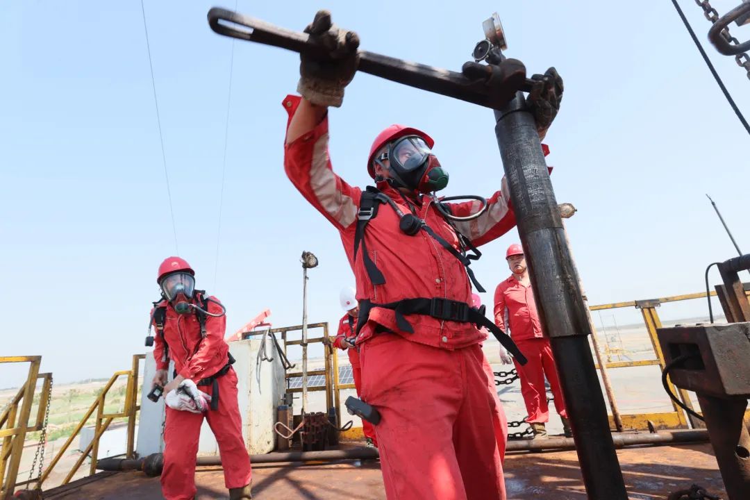 6月12日,在中国石油冀东油田高166-53井作业现场,位于河北唐山曹妃甸,工人们正在高温下进行抗硫化氢应急演练,以确保安全生产。人民图片网提供图片