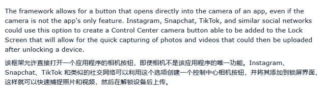 而这个框架并不局限于相机类型 App,如果需要调用摄像头, App 可以在锁屏界面上使用。IT 世界援引媒体报道,Instagram、Snapchat、TikTok 等待社交网络可以利用这个框架,在控制中心建立相机按钮,同样在国内环境下,锁屏界面也应该可以直接支持登录支付宝、微信的扫描功能,但是这需要未来应用的适应和更新。