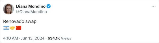据悉,阿根廷外交部长蒙迪诺在此消息公布后。(Diana Mondino)欢迎来到这里。她在社交平台上“X上面写着“再次交换”,并配有两国国旗和握手的表情符号。
