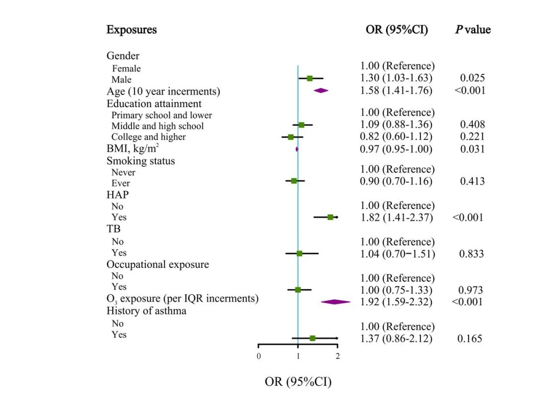 这项研究是一项集体研究,涉及15至50岁的中国西部地区的低收入和中产阶级。研究人员使用多变量逻辑回归模型来检测长期臭氧暴露与年轻人COPD的关系。