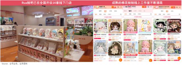 以“正规军”为例,Rua 娃娃吧,红萝卜啊,你好岛等品牌正在通过 IP 联名等形式,批量销售成品棉花娃娃,试图成为娃圈中的“泡泡玛特”。