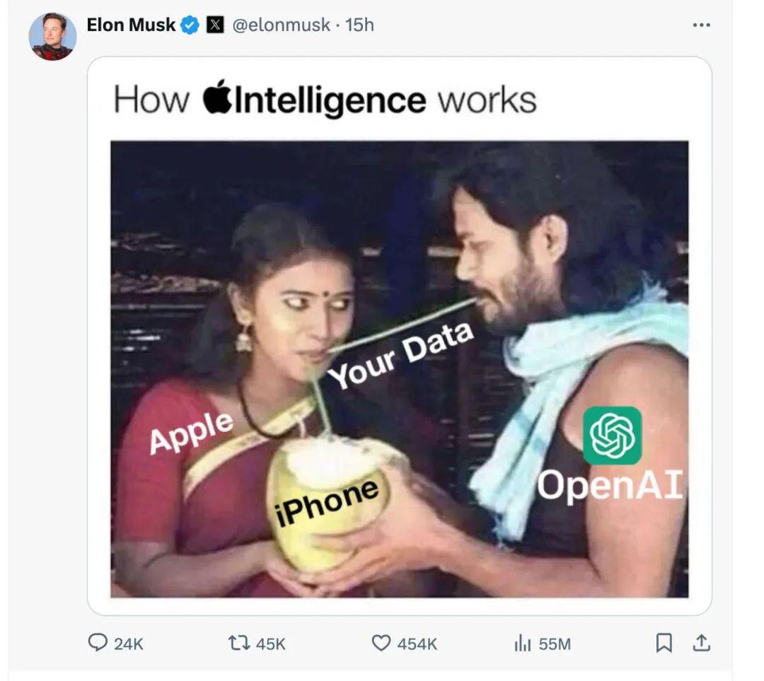 相反,马斯克发了七篇文章。 ,狂喷苹果完全访问了OpenAI的ChatGPT。他甚至在库克的帖子下放大了自己的脸,说如果库克不阻止这个令人毛骨悚然的植入软件,他会把禁止苹果设备进入自己的企业,并给出一个科技界广为人知的表情包。