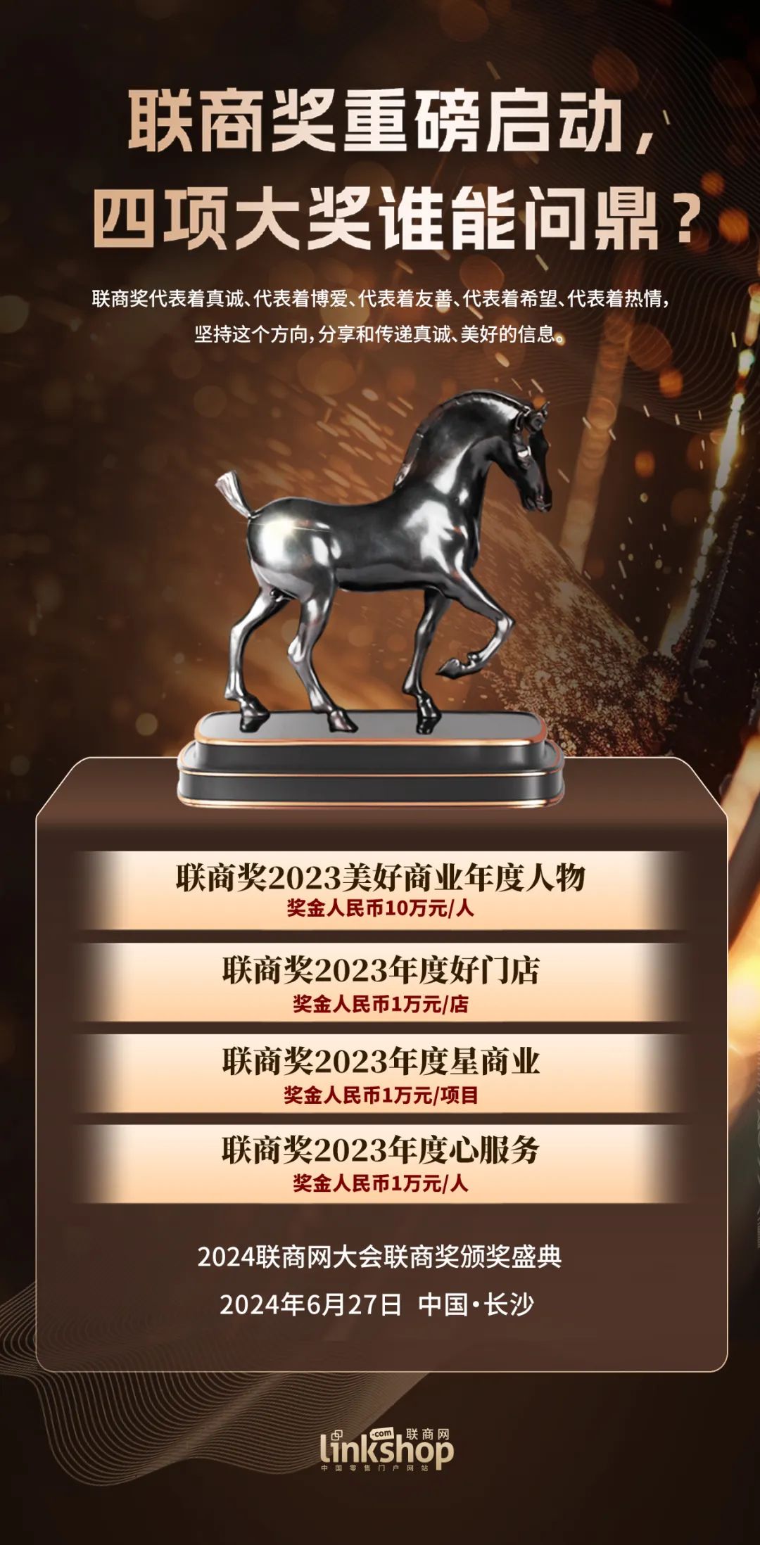 本次会议将颁发2023年美好商业年度人物、2023年好店面、2023年星商业、2023年心服务四个联商奖项。获奖名单将在2024年联商网会议上公布。除荣誉外,每个获奖名额将获得1万元大奖,总奖金估计高达40万元。