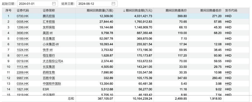 值得注意的是,港股上市公司今年的回购规模已经超过1000亿港元,有望打破2023年1245.6亿港元的回购历史。