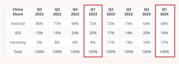 从数据上可以看出,目前中国市场上的智能手机操作系统已经呈现出三分之一的局面。其中安卓是 68% 更大的优势牢牢把握第一名的位置,而第二名的竞争则更加激烈。由于这是因为 iPhone 表现不佳,从去年第四季度到今年第一季度,iOS 减少了 4 %,这使得鸿蒙有机会超越鸿蒙的机会 iOS。