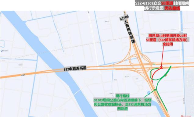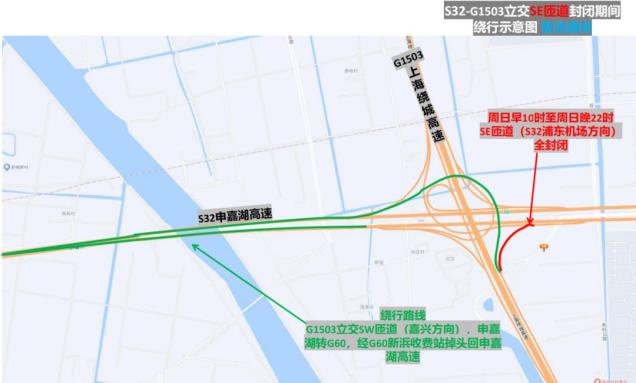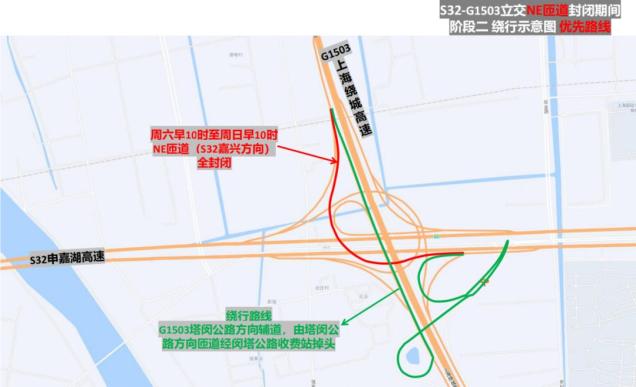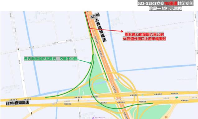 2、NE匝道(第二阶段,安亭方向于浦东机场):全封闭将于周六上午10:00至周日上午10:00进行,通过塔闵公路收费站,车辆可沿G1503辅道向南(通过闵塔公路坡道)转向S32申嘉湖高速主线。或者通过G1503立交NW匝道通过S32申嘉湖高速(嘉兴方向)转向G60申嘉湖高速,再通过G60沪昆高速(上海市区方向)转向S32申嘉湖高速。