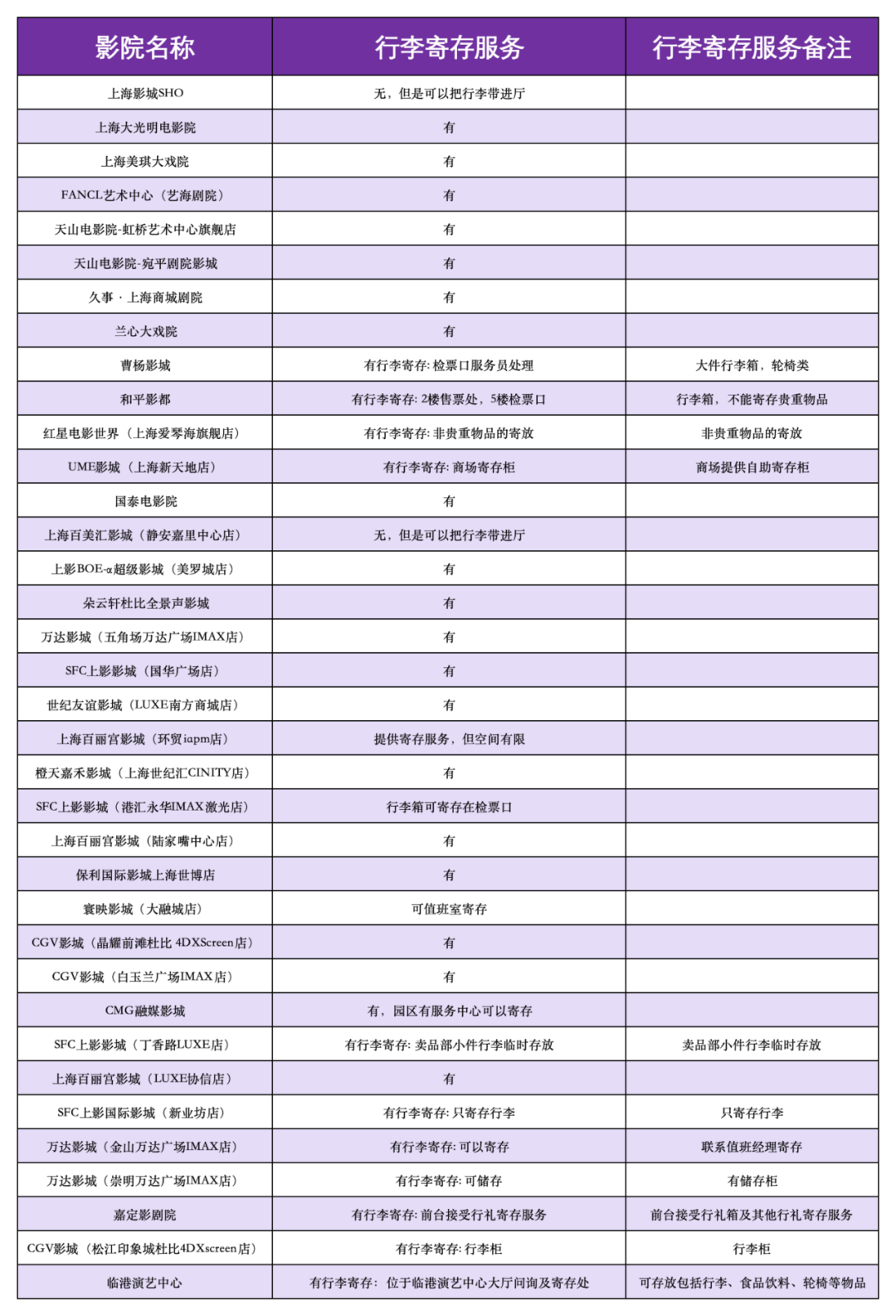 为了让外国粉丝安心看电影,上海大光明电影院、上海美琪大戏院、FANCL艺术中心(艺海剧院)等很多展示电影院都动了脑筋。、34家展映影院,如天山电影院-虹桥艺术中心旗舰店,设立行李寄存服务。