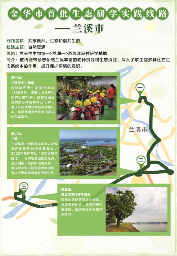 线路以“生态资源”为主题,连接兰溪三中生物馆、兰湖、游埠洋港村三个研究基地,一路领略兰溪丰富的物种资源和生态资源,深入了解生物多样性在生态系统中的作用,提高环保意识。