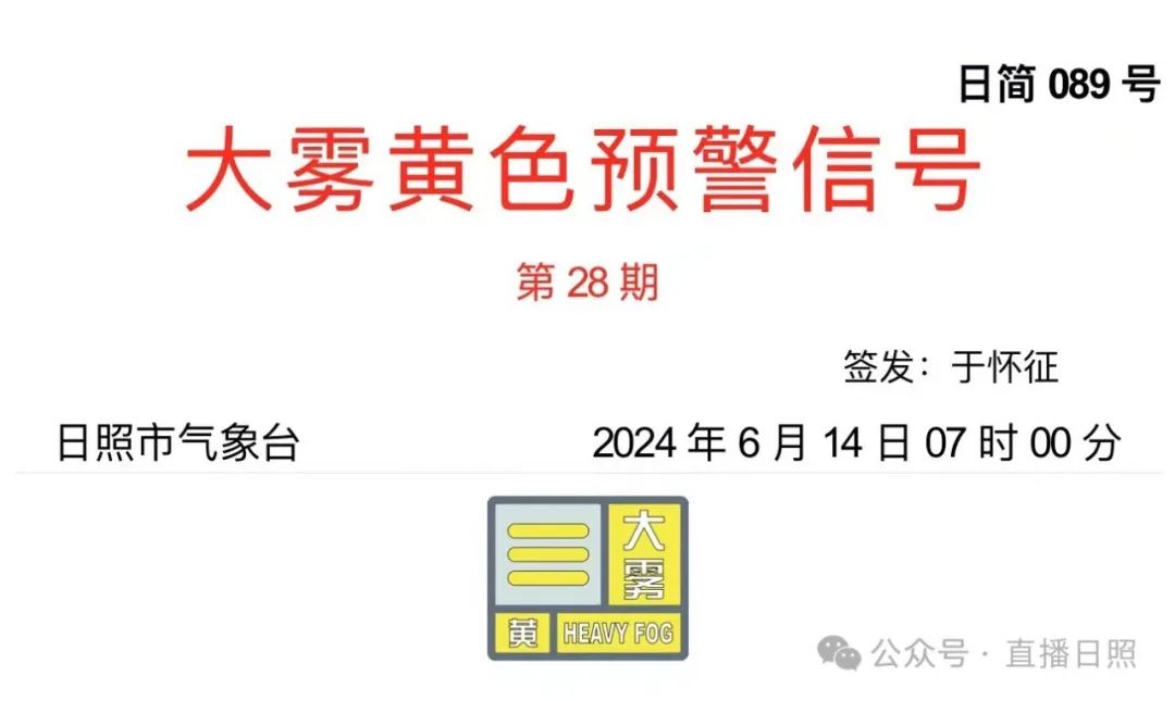 2024年6月14日07时00分,日照市气象台发布了东港区、岚山区大雾黄色预警信号:目前,我市近海水域、东港区、岚山区沿海城镇和街道可见度低于500米。预计今天上午大雾天气将持续,部分地区可见度低于200米。