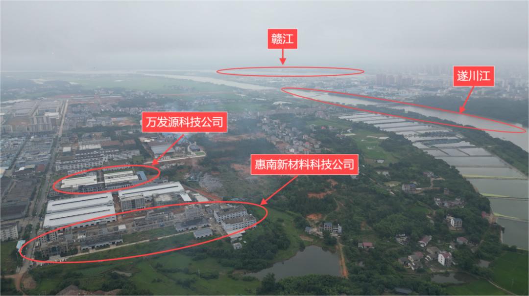 遂川江是长江二级支流,在遂川江汇入赣江前一站吉安市万安县。检查组在这里发现了异常情况。在遂川江一公里范围内,万安工业园建设了惠南新材料科技有限公司年产4000吨添加剂、万源科技有限公司电路板化工产品5000吨等两个化工项目。