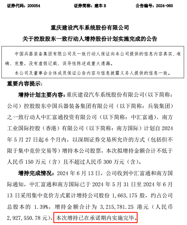 五月三十一日至六月十三日,中汇富通投资有限公司、南方工业国际控股(香港)有限公司累计加持建车B股份166.32万股,加持总额321.58万元,已在承诺期内实施。