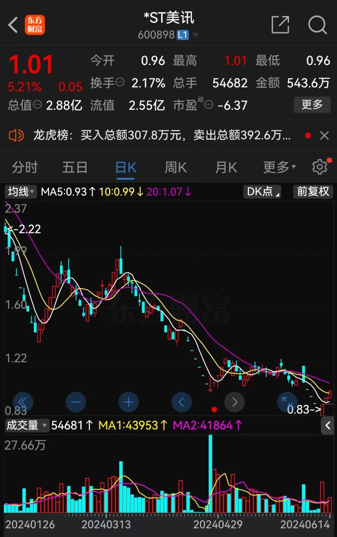 其中,截至6月14日收盘,*ST深天市值2.82亿元,连续8个交易日市值低于3亿元;*ST美讯市值2.88亿元,连续7个交易日市值低于3亿元。
