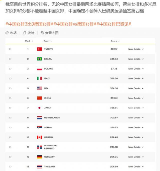 中国女排按现在的积分分数。 333.63 分数,即使中国女排最后两场比赛都是 0-3 输了,荷兰女排 302.57 和多米尼加女排一起 266.75 没有一个能超越中国,所以中国女排明确表示不会掉进巴黎奥运会抽签第四档。