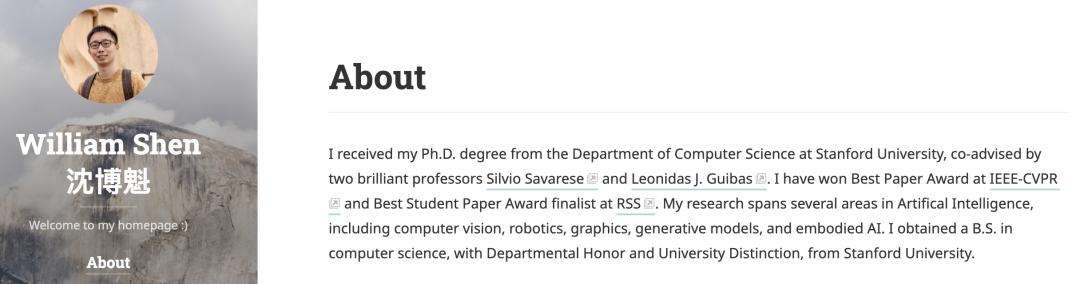 他的研究包括计算机视觉、机器人学、图形学、生成模型和具体智能在内的许多领域。他的论文获得了许多奖项,例如IEEE-CVPR获得了最佳论文奖,并在RSS上获得了最佳学生论文奖的决赛。