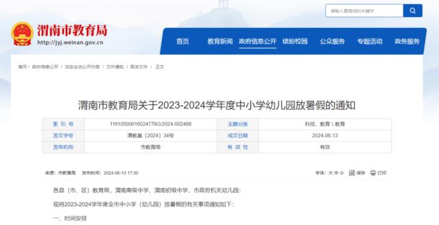 6 月 14 日,市教育局发布了《关于市教育局的公告》 2024 今年全市中小学幼儿园暑假和秋季学期开学时间安排的通知,具体安排如下: