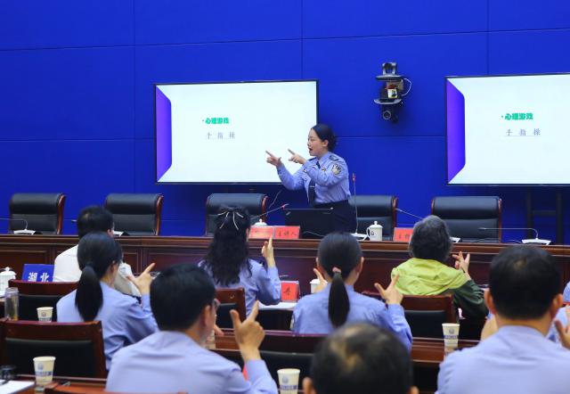 ”“你是否常常感到不快乐?”“被情绪控制住了怎么办?“心理学家根据公安工作高韧性、高压力、高风险的特点,通过“健康巧手”、“雨滴拍打”、“桃花盛开”、“数字密码传递”等有趣的游戏,引导大家学会交流、发挥潜力、感受幸福,以乐观的心态接受自己,积极生活,快乐工作。在寓教于乐的活动中,现场民警辅警“松了弦”,笑声不断,气氛热烈。