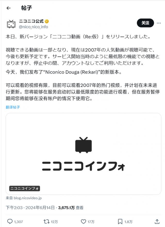 NicoNico紧急开发“极简版”网站需要一个多月的时间才能恢复。