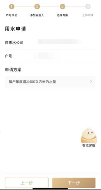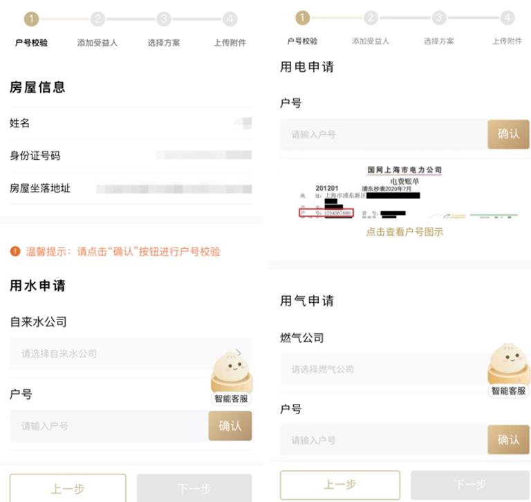 完善申请人信息和房屋信息,根据水电缴费通知信息输入相应的户号,进行户号验证。