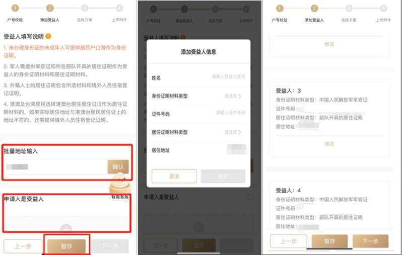 验证成功后,需要输入受益人的身份证号、姓名等信息进行验证,同一居住地址可以批量重用。同时,您可以点击“存储”按钮保存未提交的信息,并在下一次处理时继续处理。