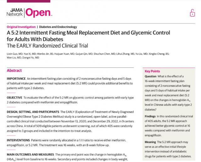 最近在美国医学会刊登了一份期刊(JAMA Network Open)网上公开平台论文显示:早期糖尿病患者采用 5 2 轻度禁食的生活习惯干预方式可以在血糖、血压、减肥等指标上有惊人的改善,这也为早期糖尿病的治疗提供了新的思路。