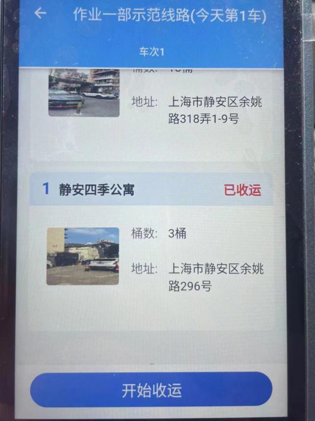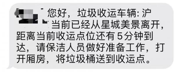 在显示屏上显示干垃圾清理车辆时 5 几分钟后到达小区,周师傅也收到了一条短信。,于是,他开始把干垃圾桶拖到指定的交付点。过了一会儿,清运车慢慢驶入小区,开始收集和运输干垃圾。