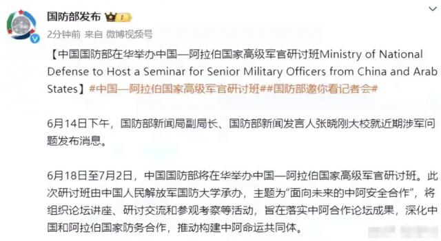 6 月 18 日至 7 月 2 日本,中国国防部将在中国-阿拉伯举办中国高级军官研讨会。