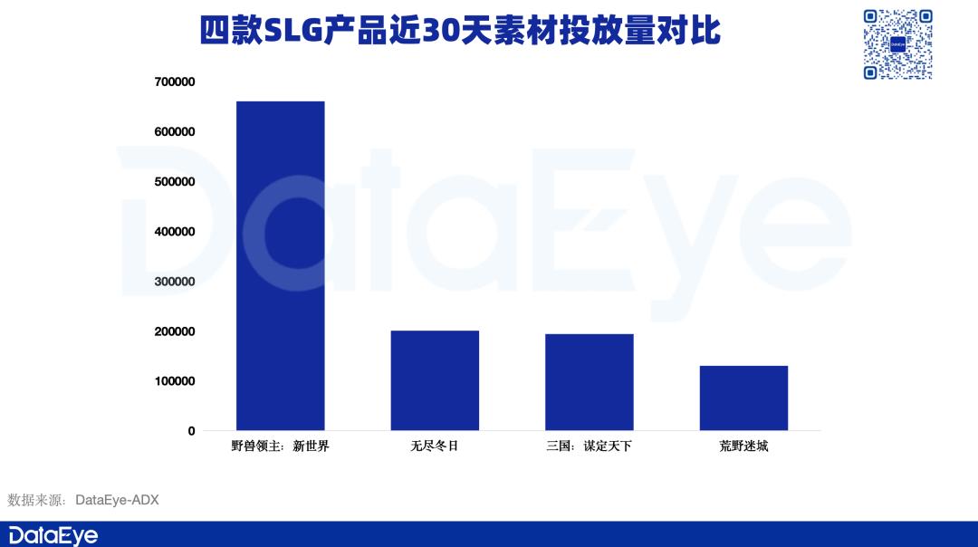1、稳定持续地高投放, 相比之下,《野兽领主:新世界》最近30天的素材投放量,以及《无尽冬日》、两款SLG新游《三国:命令世界》要高很多量级。根据数据估计,DataEye研究院在购买量侧投入的《野兽领主:新世界》资金估计可达3亿元以上。