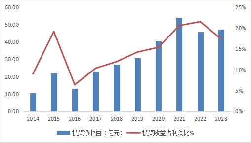 正因为如此,水电业务的成本比较稳定,保证了水电上市公司的基本盈利能力。例如,长江电力的毛利率长期保持在60-70%之间的小幅波动。而且受偿债周期的影响,公司财务费用跟随水电站生命周期呈现阶段性波动,导致净利润也具有一定的周期特征。但近年来,长江电力以水电、配售电力、智能综合能源为重点,积极开展产业链上下游及相关新兴领域的战略投资,稳步进行资本运营。2014-2023 2023年,公司投资收益保持在每年10亿元以上,2023年。 近十年来,投资收益占归母净利的比例接近15%,达到47.5亿元。这种情况在一定程度上平滑了发电业务波动对公司业绩的影响,使公司整体净利率保持在40%左右的领先水平。