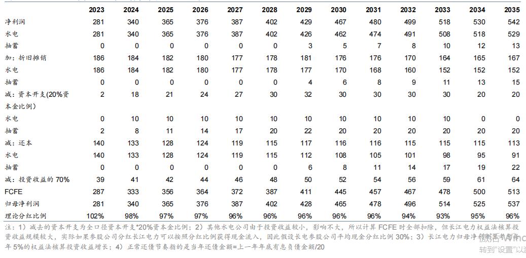 展望未来,稳定而充足的现金流无疑是企业持续分红的基础。由于长江电力 2023 在未来几年的偿债高峰期,大量的还本付息需求可能会影响公司的实际利益现金流,因为年收购乌和白水电站产生了较高的有息负债。但考虑到目前金融环境下资金成本较低,公司信用评级水平较高,我们认为公司有借新还旧的动力,而且因为公司承诺 2023-2025 每年的分红比例需要实现净利润 在70%的综合影响下,预计未来公司FCFE的充足程度将保持在领先水平。