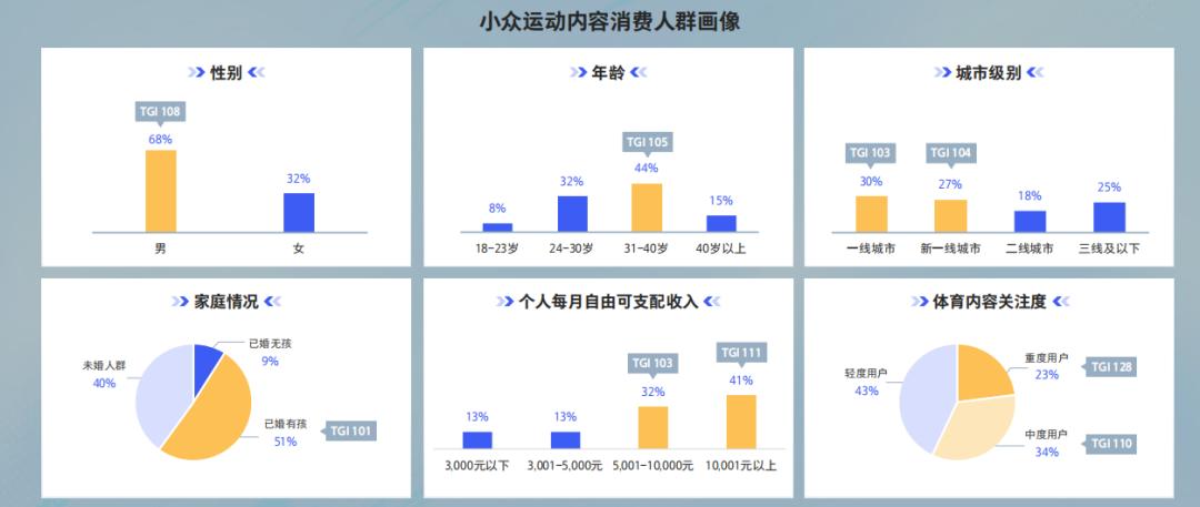此外,在小众运动扩圈所吸引的内容消费群体中,主要群体是一线和新一线的高收入男性。他们不仅密切关注体育内容,而且有很高的付费意愿和参与体育的趋势。他们愿意把精力和金钱投入到少数民族体育中,是品牌不可多得的优质用户群体。