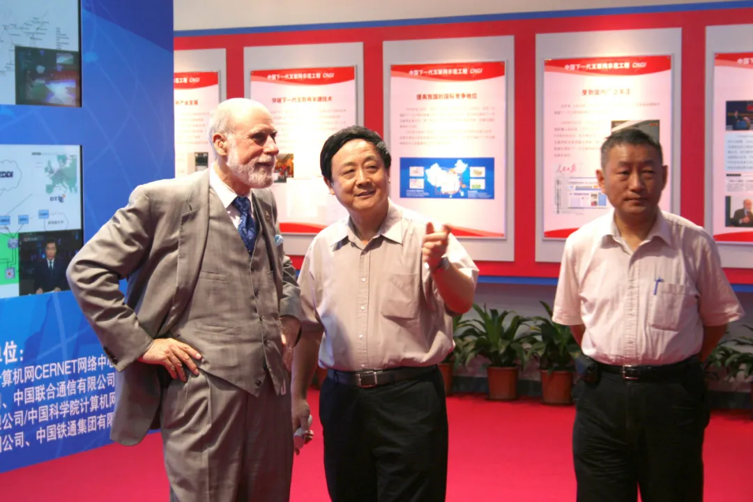 温顿·瑟夫(左)曾多次访问清华大学,并与学校专家交流互联网技术,这是他访问期间与吴建平(中)的交流。、李星(右)在一起