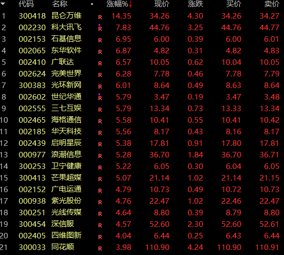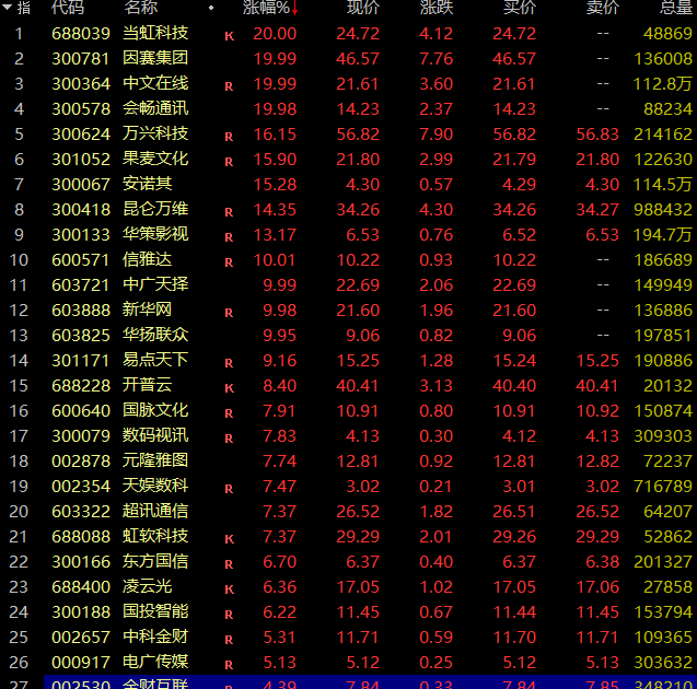 该行业的所有股票都在上涨。当虹科技、因赛集团、中文在线、会畅通讯等批量涨停20%时,超过一半的概念股涨停或超过10%。