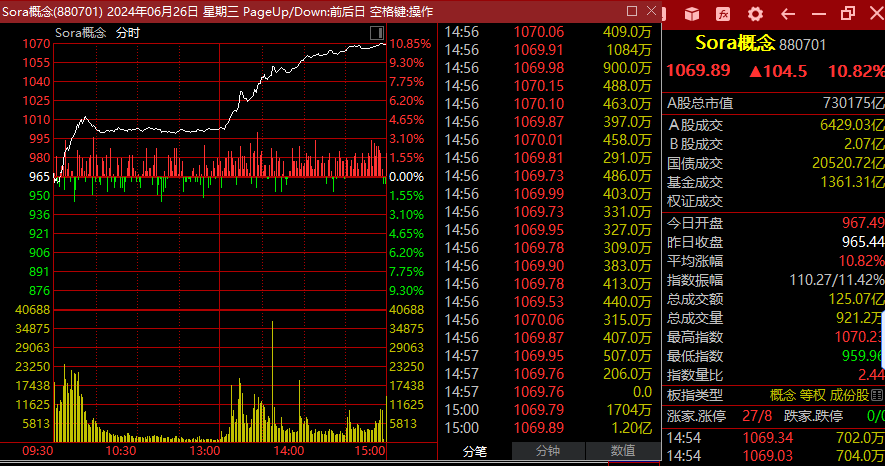 热点方面,人工智能股全线暴涨,Sora概念指数罕见暴涨10.82%。自概念指数推出以来,单日涨幅最大,一举收复前一周的跌幅,成交量较昨日大幅增长200%以上。
