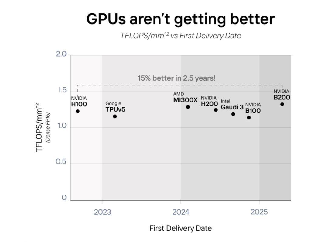 最近由于摩尔定律放缓,GPU 在很大程度上,性能的提高取决于芯片面积和功耗的增加。无论是英伟达 B200、AMD MI300X 还是 Intel Gaudi 三、都不约而同地使用。「二合一」提高性能的方法,功耗也翻了一番。