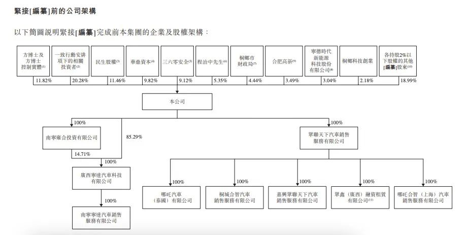 招股书显示,在IPO之前,哪吒汽车创始人、董事长方运舟博士持有约11.82%的职位,总共控制约20.28%的股份;民生股份持有11.46%的职位,是公司最大的股东;华鼎资本紧随其后,持有约9.82%的职位;三六零安全的周鸿祎持仓约9.12%。