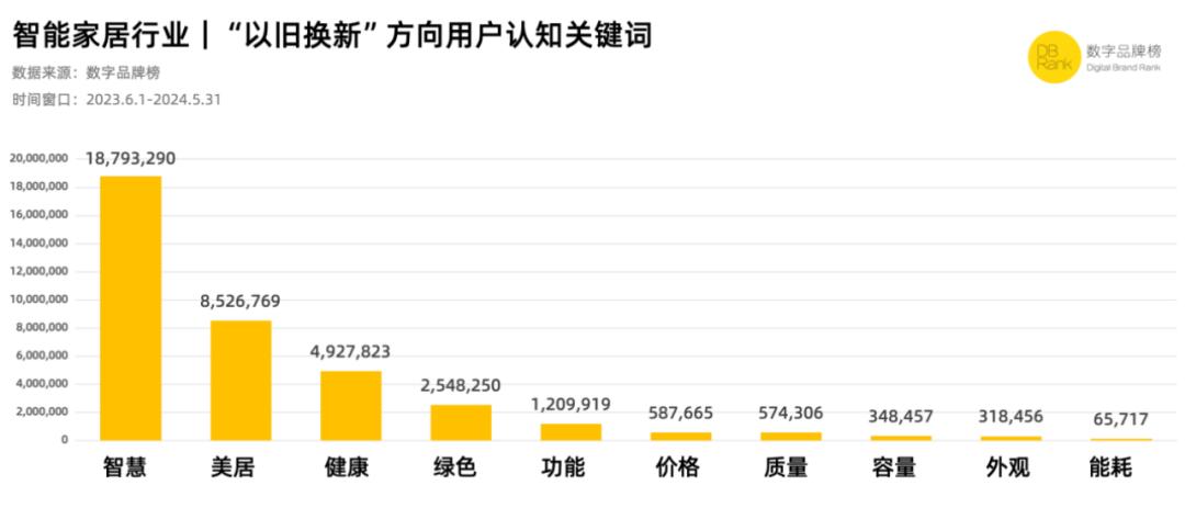 第二,居住空间也被赋予了更多的健康考虑。『数字品牌榜』在618之前,我们研究了大众在智能家居领域的“新旧置换”,发现“健康”已经成为影响消费者选择家用电器的重要因素之一,主要表现在空调净化、杀菌气体、冰箱保鲜锁等生活需求上。